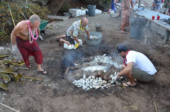 The pit was uncovered for the traditional pit luau pork, beef and fish roast.
